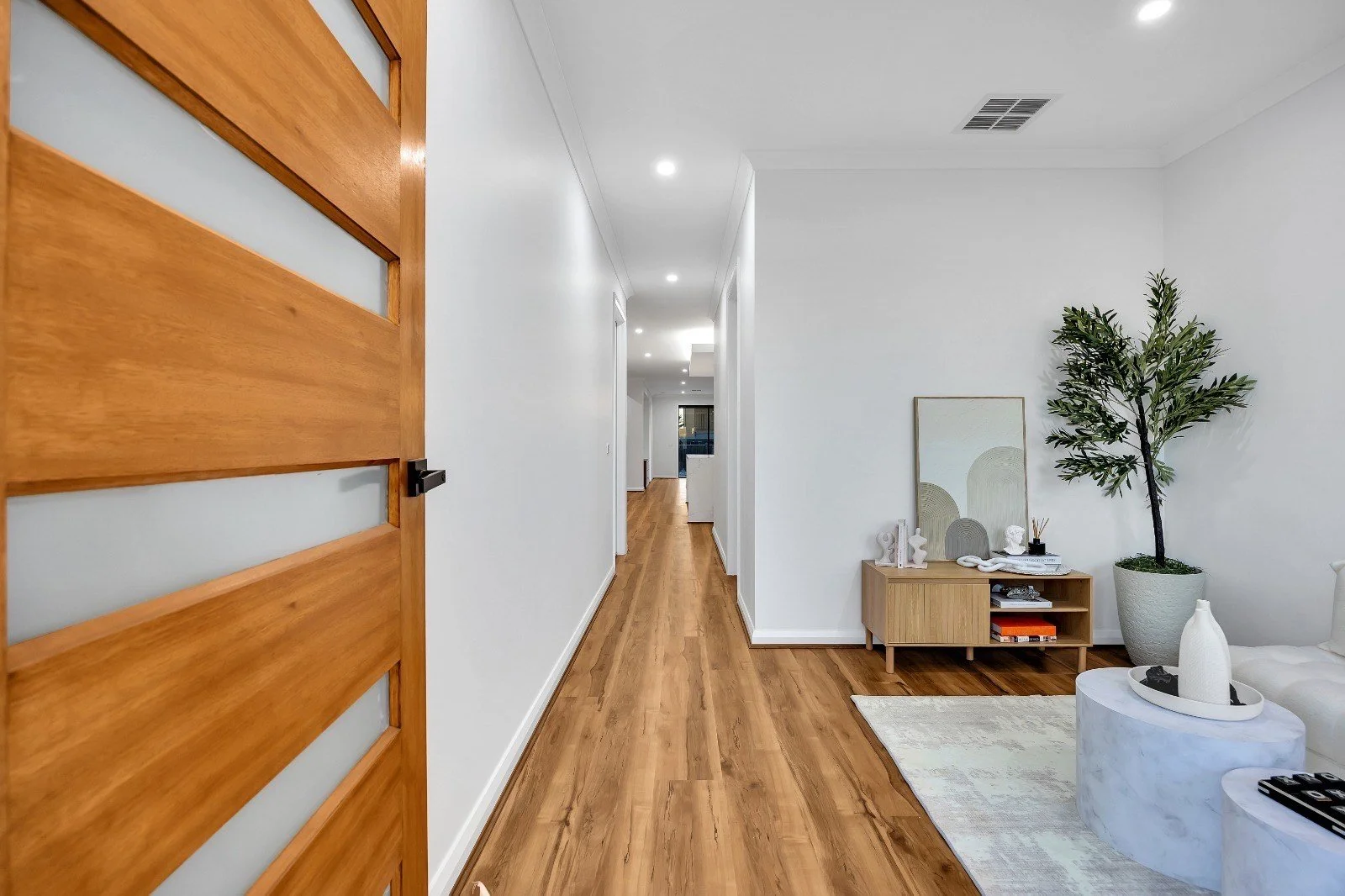 A contemporary, light-filled home defined by warm timber tones, soft neutrals, and layered textures. Thoughtfully curated décor and subtle statement pieces add depth and contrast, creating a cohesive space that feels both refined and inviting.